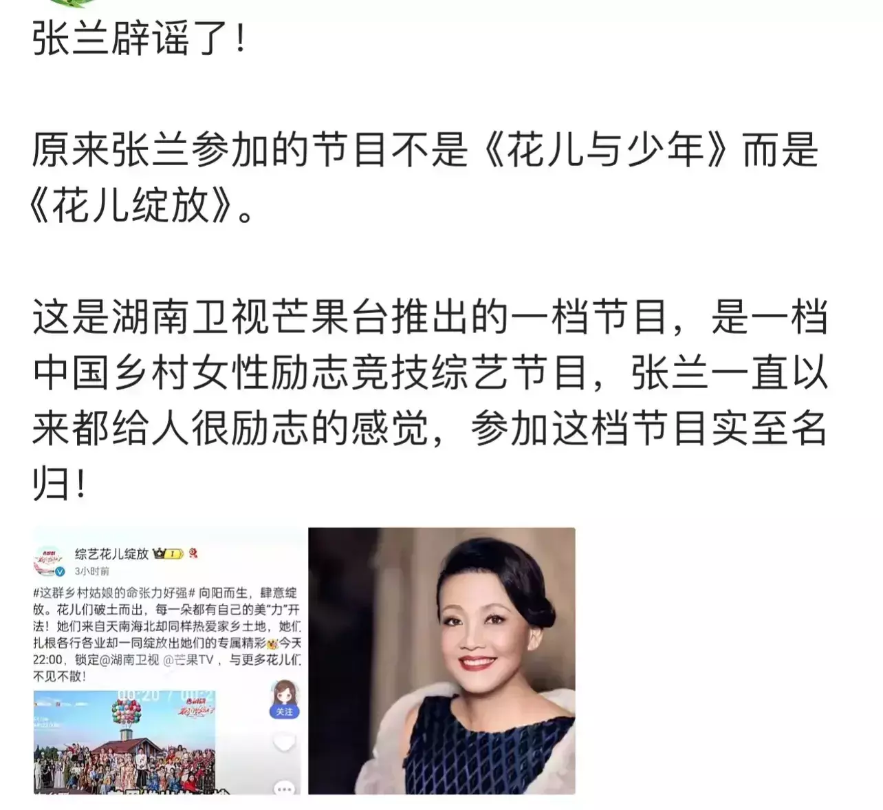 成果助播和网友皆认为张兰插足的综艺是《花儿与少年》。于是大把网友给花儿剧组打电话考虑,节目组报恩综艺皆录结束,演员莫得张兰的名字。